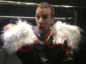 This year Santa’s suit got an upgrade! But with upgrades, tweaks usually need to be made. So the boots sort of snuck down to the ankle. As you can see in the picture the fur cuff got a little bit too low! Well, when fireworks are shooting, they melted a nice path through those suckers!
