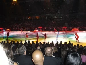 As I walked further I realize that all the lights were still on the ice and waiting to be hoisted up into the air. So group number five was taught off ice with no music since they were doing a sound check. You can’t even hear the person next to you when that is happening with all those speakers blasting. So after walking through the formations, the lights were finally up and onto the ice we went. Yet again, instruments/speakers were being checked so we skated the routine with no music. Now, I know most all of the Beatles tunes, so I sort of had an idea what to expect.