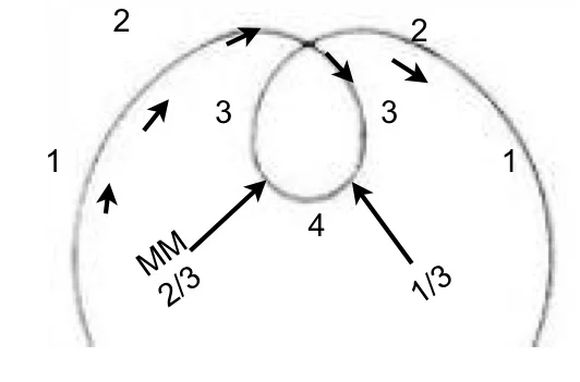 No matter what loop you are doing, rotate your arms and shoulders in the direction you are going. Increase your knee bend and pressure to the ball of the foot towards to toe as you proceed into the loop. You stay on the #4 position on your blade which creates a perfect circle between the 1/3 and 2/3 mark. At the 2/3’s mark of the loop, or the MM (Magic Moment see diagram below) you unwind your shoulders, rock back to the number 1 position on the blade, and rise out of your knee – just like coming out of an edge pull.